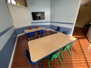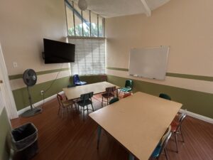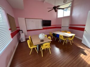 The parking lot has a driveway that is a loop. The door is labelled “Classrooms”.